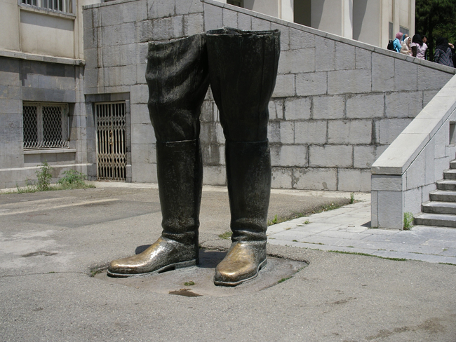 走进萨德阿巴德王宫大门,只见白宫宫殿外面有一双巨大的双腿铜靴,应该是巴列维王朝的创造者礼萨汗的雕像,但在1979年伊斯兰革命时, 愤怒的群众把铜像锯掉了,留下这双腿铜靴,作为对那个时代的见证。