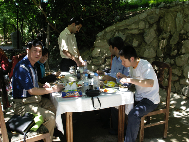 伊朗人对接待客人很讲究,以后的经历也证明了这一点。无论走到哪里,只要一坐下来,就会有人送上咖啡茶饮,水果点心。一般来说,在中国谈论工作的时候,茶水是有的,水果点心却很少供应。午餐一般在下午2-3点,然而,Pakshoo公司的技术总监告诉我们,星期五是圣经中规定的休息日,他驾车带我们在市里转了好久,马路两旁商店的大门都是关着的,转着转着,就把我们带到了据说是加兹温市唯一开门的餐馆,上楼一看,食客近满,侍应生引我们入位就席。我们只想品尝具有波斯风味的菜肴,为我们端上来的是烤鱼,烤鸡,烤牛肉;黄澄澄的米饭,据说是用浸泡藏红花的水浇煮的。