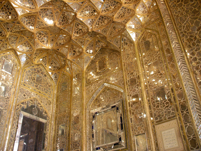 一步入大厅,立即被遍布四周的豪华装饰所吸引,以兰色小块瓷砖拼奏而成的一幅幅的波斯风格的图案,十分瑰丽,让人惊讶不已。站在正对拱顶的回音石上击掌,可以听到七声宏亮的回音。
