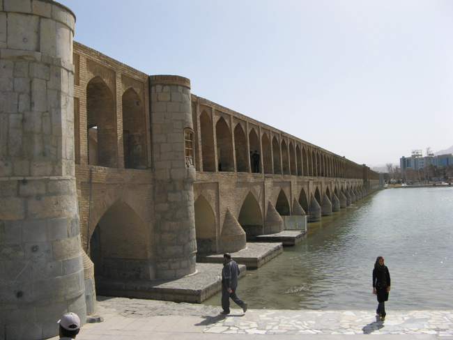 在伊斯法罕,我们还游览了旅游胜地——33孔桥。这是个美丽的地方,游人如织。33孔桥建于阿巴斯国王时期,是扎因特(ZAYADEH)河上一座颇具特色的桥梁。桥面设有拱廊,桥头堡也设计的很有特点,上桥的台阶很宽。我们漫步在河边,寻找着春的气息,那水鸥在河面上自由地飞翔。不时地向人们叫唤着:春天来了,春天来了!