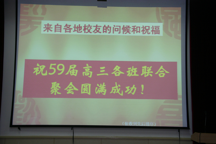 这次聚会也得到了远方校友的热烈响应。他们有的在国外,无法前来参加,或发来电子邮件,或打来电话,表示对大家的问候,也预祝这次聚会圆满成功。会上大屏幕不间断地放映着用他们的问候和祝福语制作成的幻灯片,并配上了各人当年的老照片和近照,这成了这次聚会上特别吸引眼球的一道风景线。