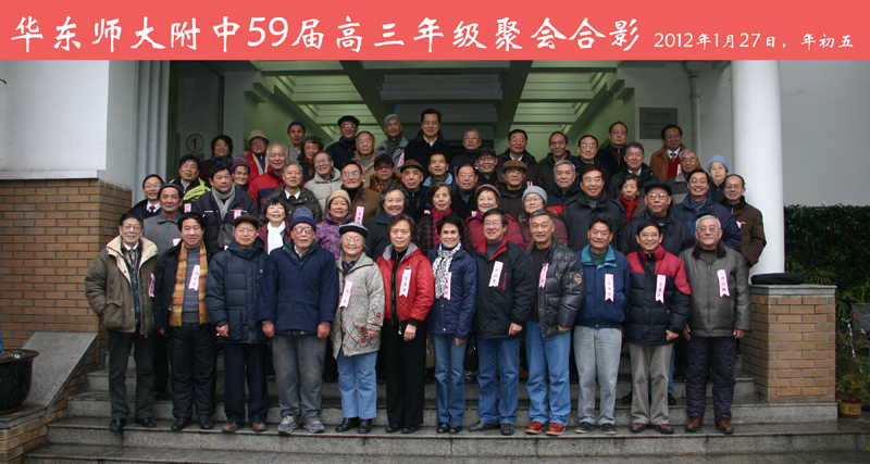2012年1月27日年初五下午,是华东师大附中的校友返校日。小雨夹着一丝丝寒意。59届高三4个班级第一次联合聚会在母校举行。中州路老校区3楼会议室里,校友们陆续来到会场,多年不见显得格外亲切。老同学们互相招呼,热闹非凡。
